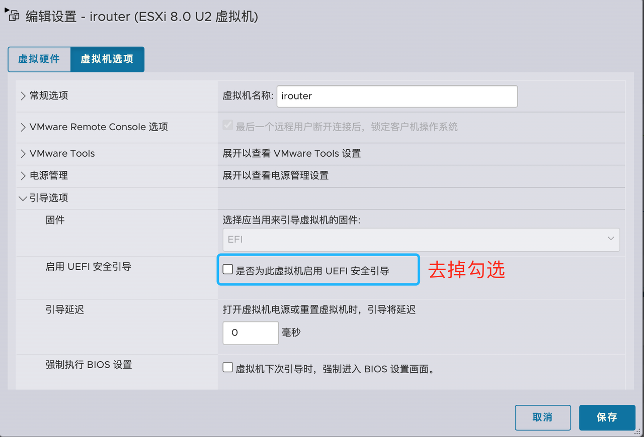 安装前,需 在虚拟机电源关闭 的情况下禁用 UEFI 安全引导: