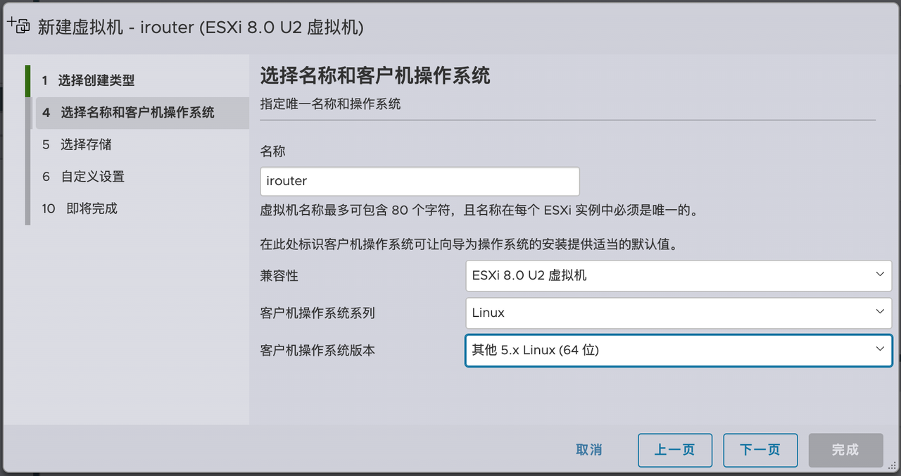 客户机操作系统类型:64位 其他 Linux 系统 5.X 或以上内核