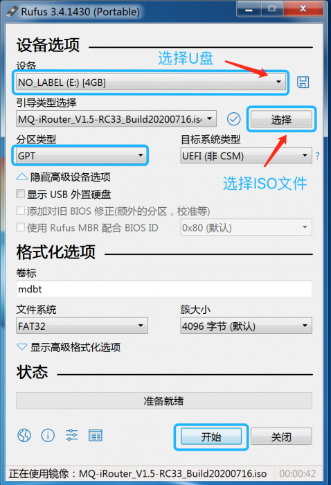 ① 选择U盘和ISO,分区类型选为 “GPT”,点击开始: