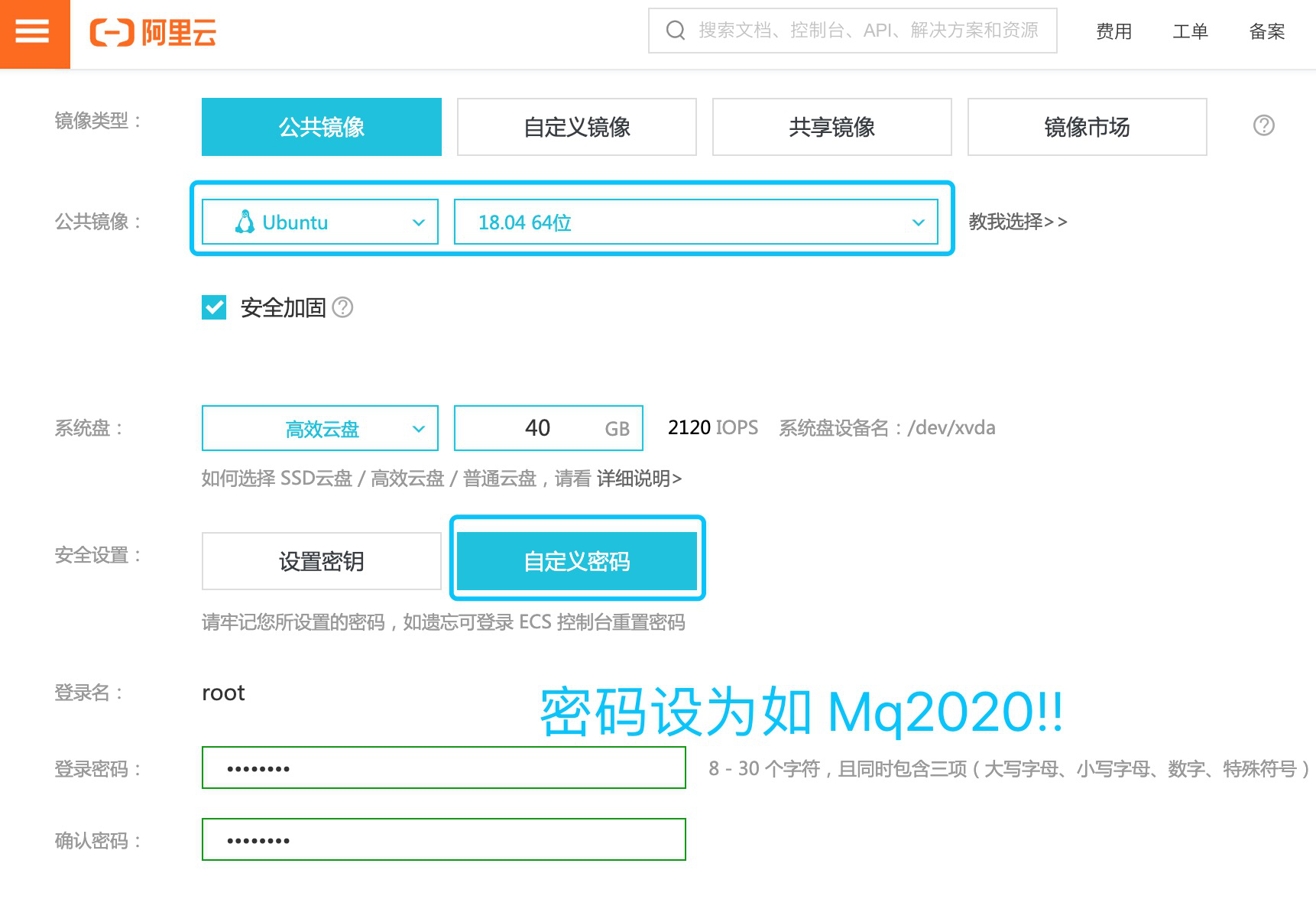 不能选 Ubuntu,因为不支持root用户登录