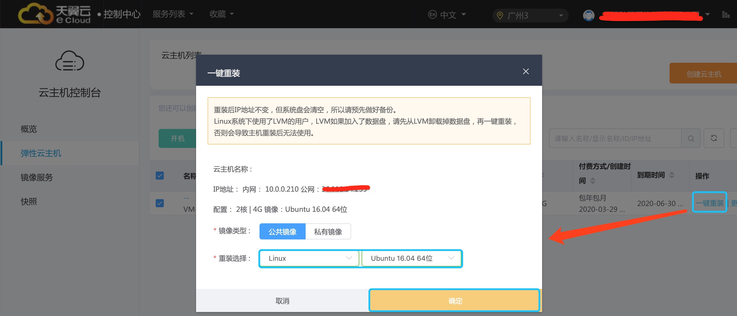 - 通过“一键重装“,更换 ECS 系统为 Ubuntu 16.04 64位