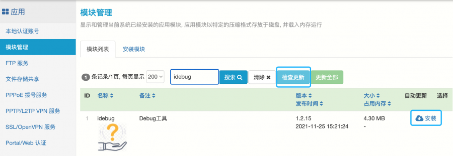 在秒开路由上,应用-》模块管理-〉检查更新,安装 idebug 模块