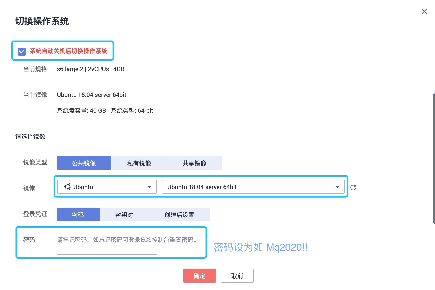 切换/重装ECS的系统为符合要求的镜像(如 Ubuntu 18.04 或 16.04 64位 或 Debian 9.0 64位)