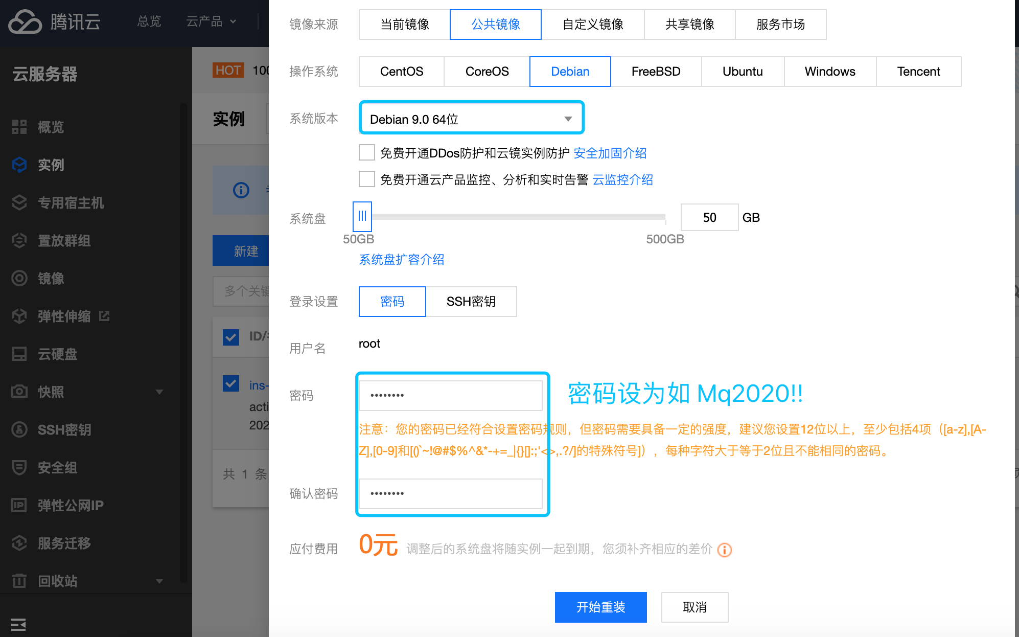 在实例中,通过更多→“更换操作系统”,更换 ECS 系统为 Debian 9.0 64位。