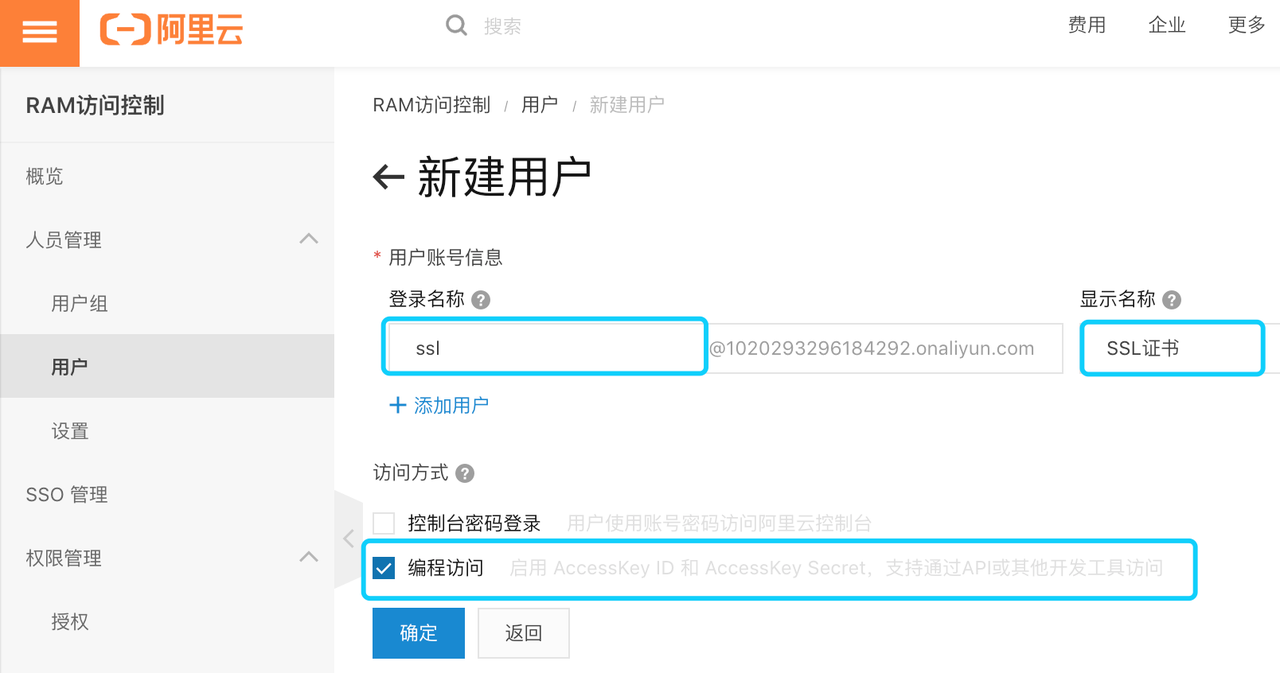2). 在左边菜单RAM访问控制-》用户-》新建用户: