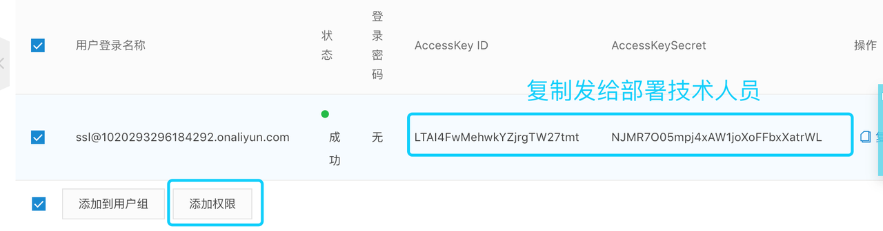 3). 创建后,将 AccessKey ID 及 AccessKey Secret 复制下来,然后继续。