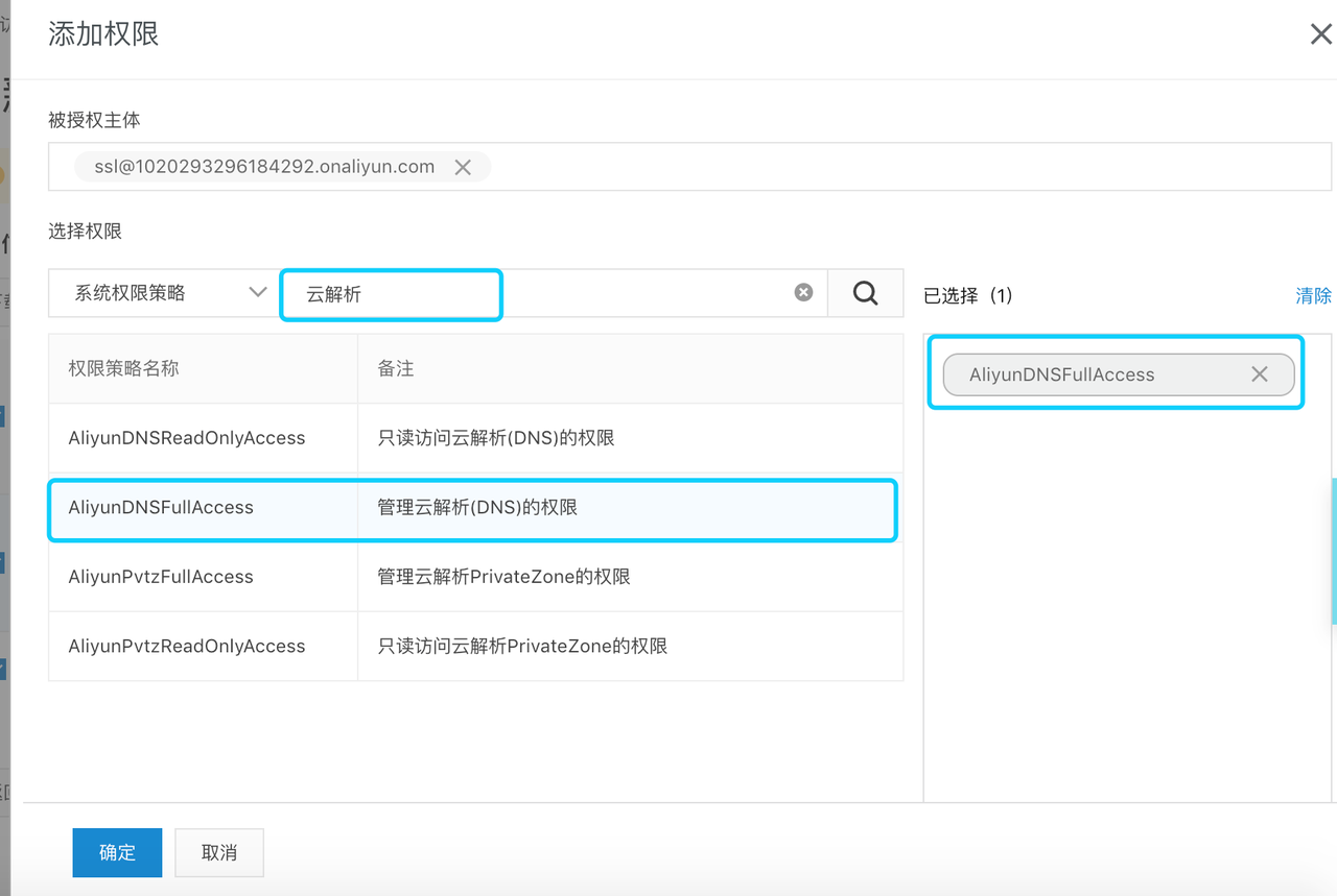 4). 添加权限如下,输入“云解析“查找:
