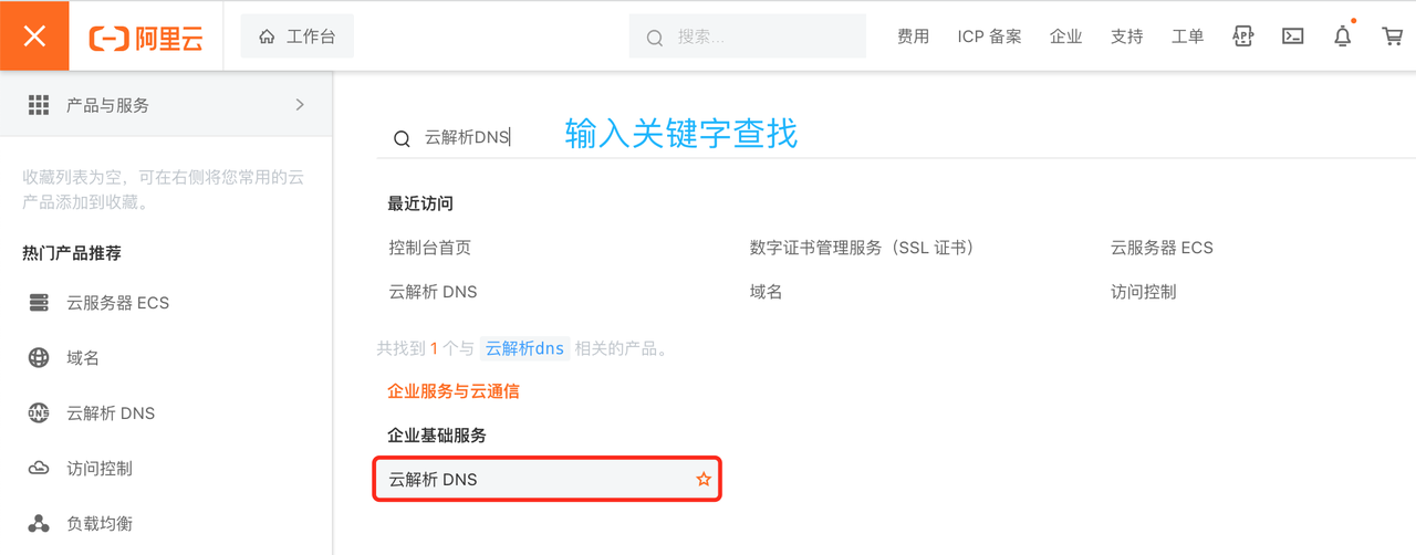 点击主导航栏中的【产品与服务】—【云解析 DNS 】,进入域名云解析列表页: