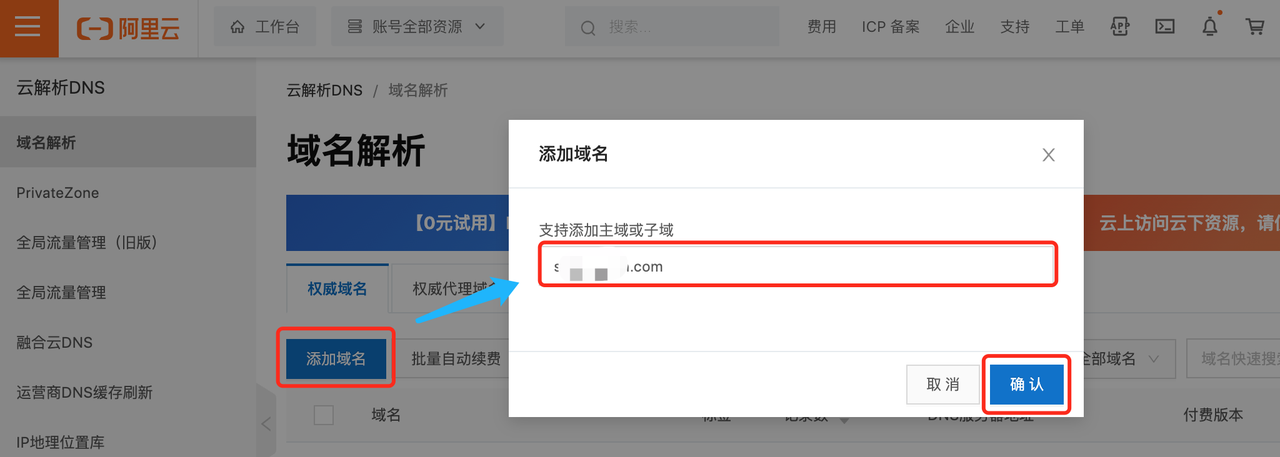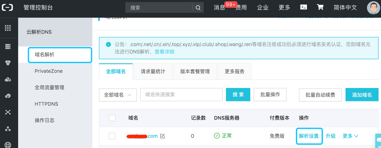 添加需要通过阿里云解析的域名: