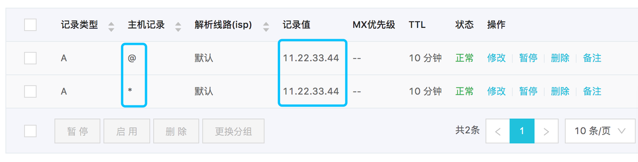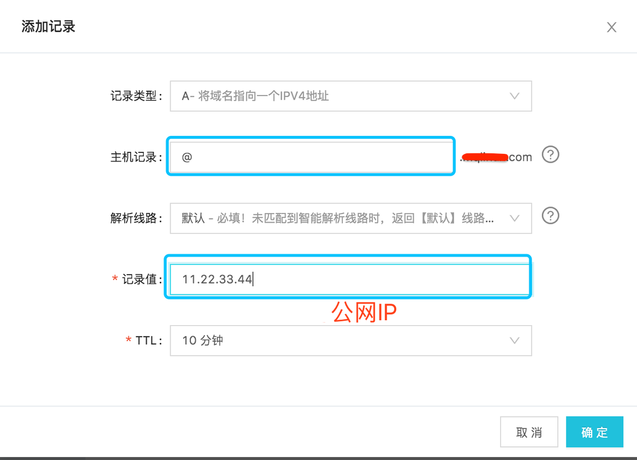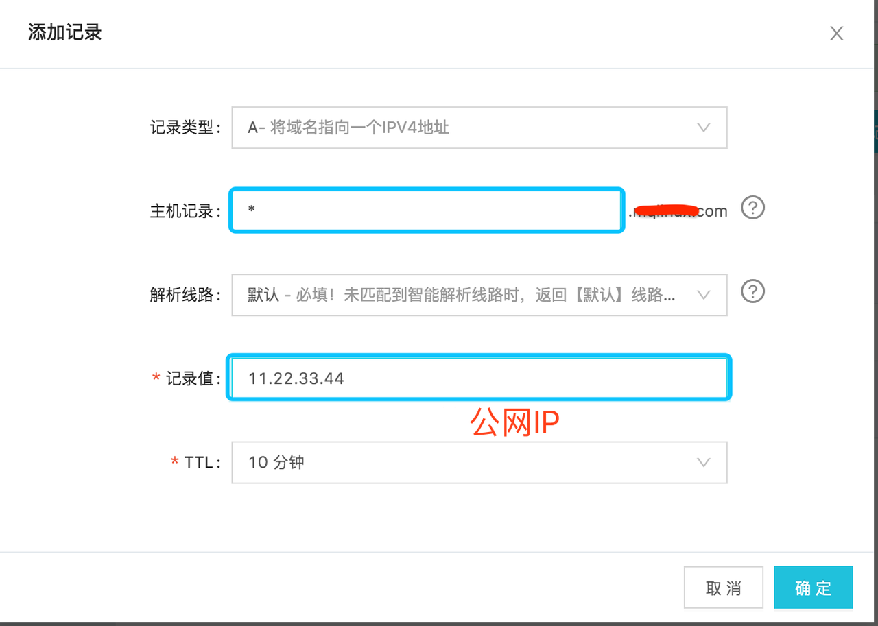 一条主机记录为 *,一条主机记录为 @(@表示顶级域名本身), 记录值都设为云登录服务的公网IP