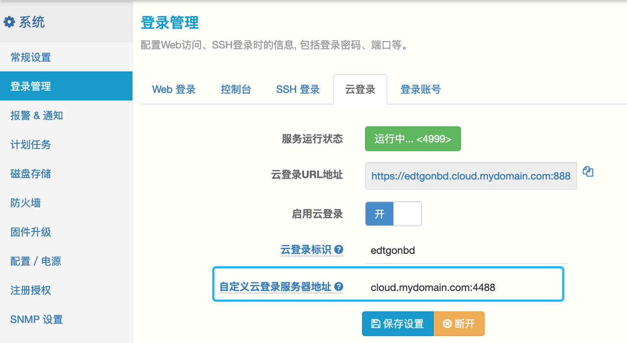 进入菜单:系统-》登录-》云登录,设置 “自定义云登录服务器地址” 即可: