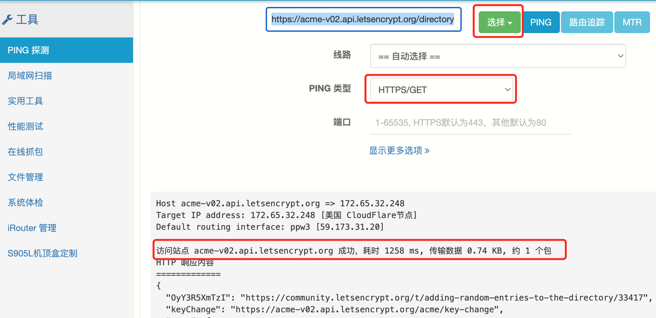 使用工具-》PING测试,类型选 HTTPS/GET: